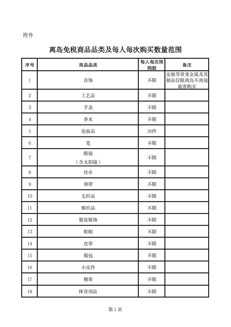 调整后离岛免税商品共47类,具体品类、购买数量、备注要求见附件,并按此执行。