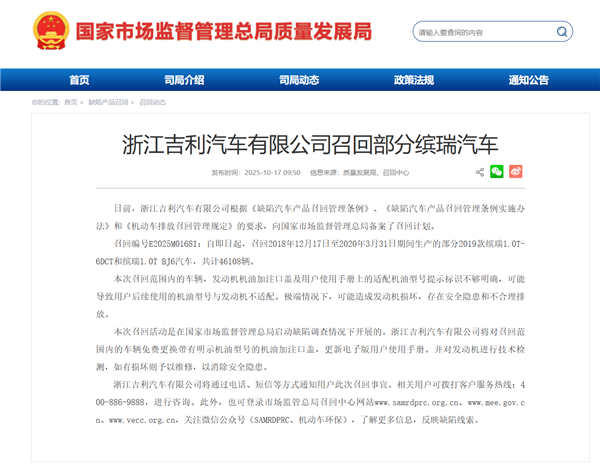 召回编号E2025M0168I:自即日起,召回2018年12月17日至2020年3月31日期间生产的部分2019款缤瑞1.0T-6DCT和缤瑞1.0T BJ6汽车,共计46108辆。