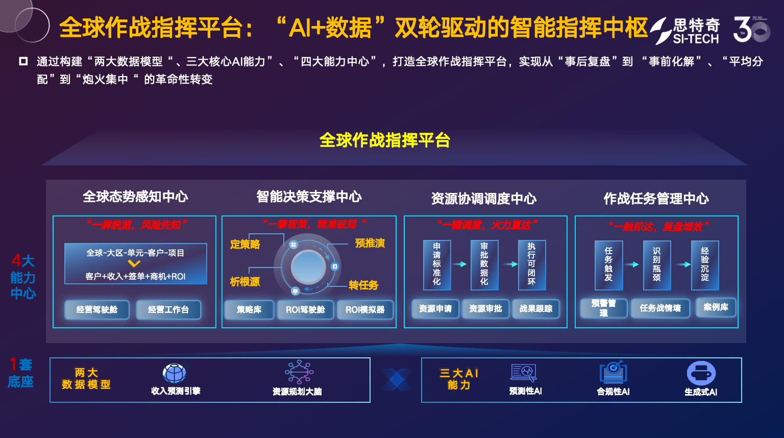 面向全球化布局需求,"政企智慧运营"方案升级打造"感知-决策-执行-反馈"端到端全球作战指挥体系,以收入预测引擎和资源规划引擎为两大核心抓手,构建全球化运营核心能力:
