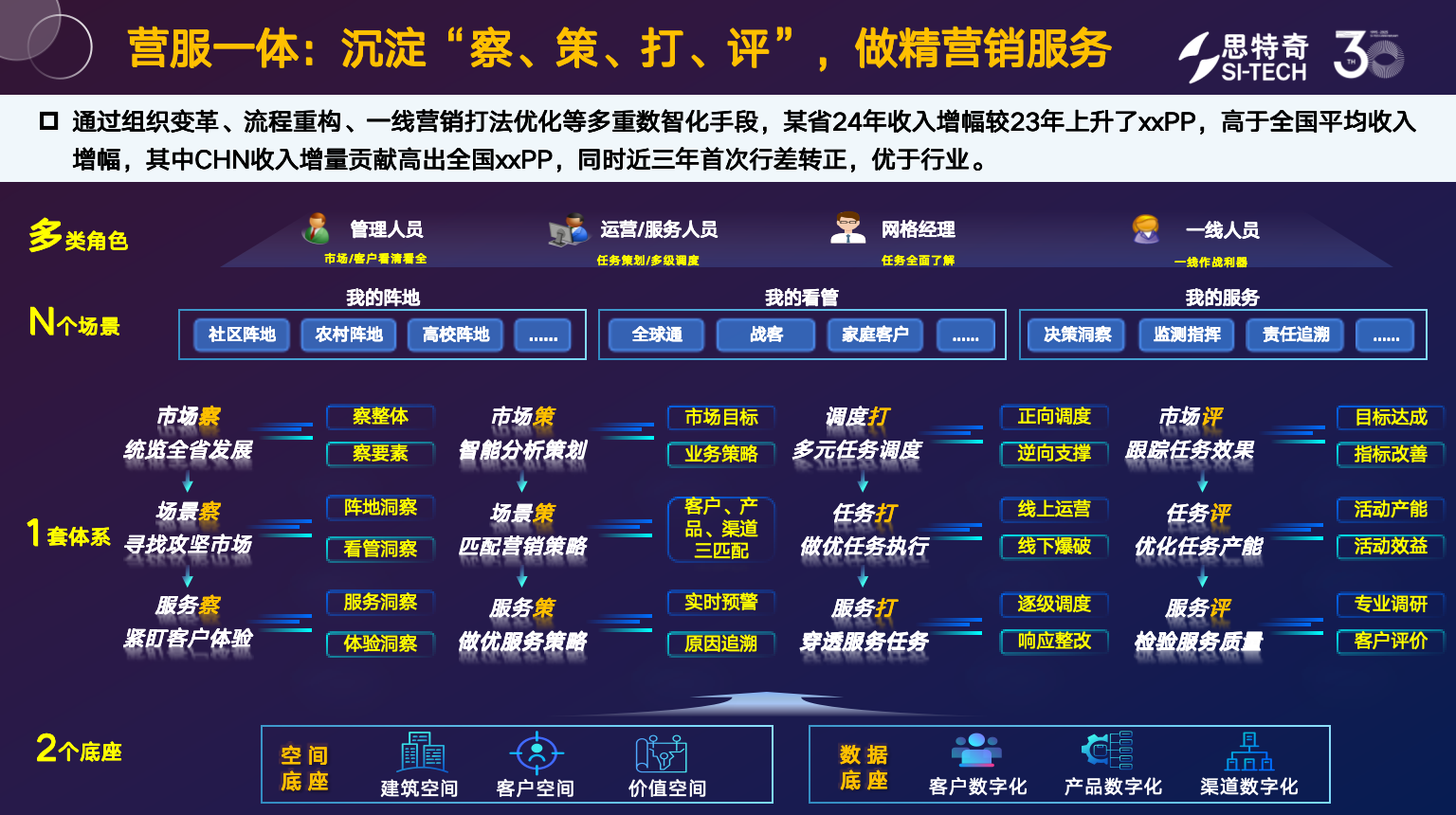 针对运营商大市场运营的核心痛点,思特奇"市场全息作战"方案以"存增一体、营服一体"为战略目标,构建全链路指挥作战体系,沉淀"察、策、打、评"四大核心能力,彻底激活市场数智化转型动能。该体系通过组织架构革新打破部门壁垒、流程重构优化业务链路、一线打法升级提升执行效能,形成"数据驱动决策、智能赋能执行"的闭环运营模式。
