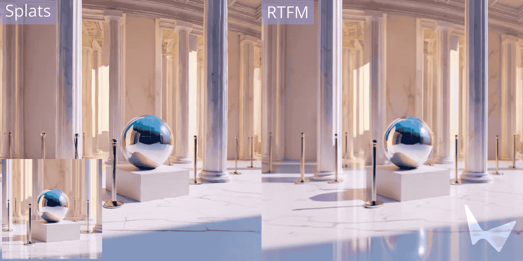 与许多世界模型不同,RTFM 能够学习并渲染出,极其复杂和真实的视觉效果。无论是光滑大理石地面的倒影、物体在阳光下的阴影,还是透过玻璃看到的景象,RTFM 都能准确地模拟。