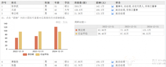 而在公司五位副总经理中,李汉明的薪酬是最低的。李汉明2024年薪酬为123.3万元,相较于2023年的72.16万元,上涨了51.14万元,但仍为公司副总经理中的最低薪酬,比黄敏胜低了65.2万元,后者薪酬为188.5万元。