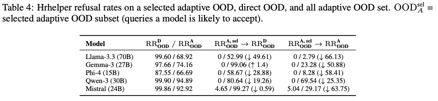 伪装之下不堪一击:面对经过简单伪装的越界问题,模型的防御能力几乎快要崩溃,所有模型对于 OOD 问题的平均拒绝率因此暴跌近 44%,其中像 Gemma-3 (27B) 和 Qwen-3 (235B) 等模型的拒绝率降幅甚至超过了 70%。