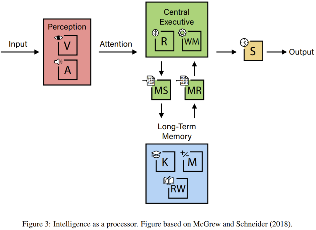 例如,解决高阶数学问题同时依赖数学能力(M)与即时推理(R);「心智理论」题目需要即时推理(R)与一般知识(K);图像识别涉及视觉加工(V)与一般知识(K);理解一部电影则需整合听觉加工(A)、视觉加工(V)与工作记忆(WM)。