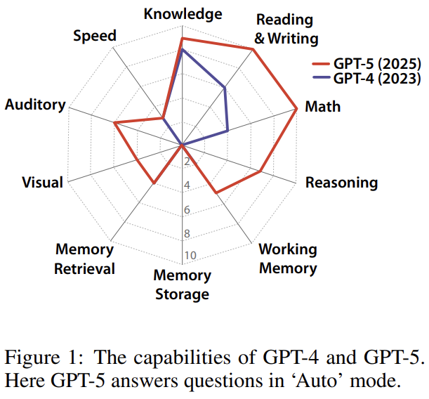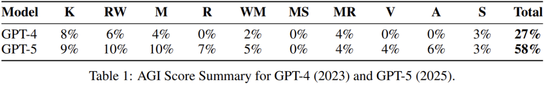 最终的 AGI 分数(例如 GPT-4 为 27%,GPT-5 为 58%)提供了一个具体的量化尺度,既展现了 AI 的迅速进步,也揭示了当前距离真正 AGI 仍存在巨大差距。