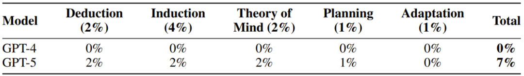 而 GPT-4 和 GPT-5 在各分量上的表现均未超过 10%,甚至在不少具体指标上都是 0 分表现。因此,可以说当前的前沿 LLM 模型离 AGI 还相距甚远。下表总结了这两个模型的整体得分情况: