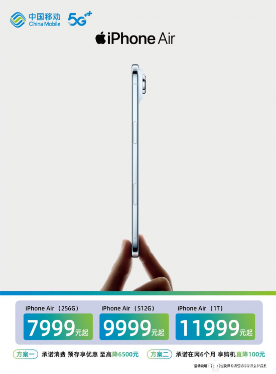 对于计划购买支持eSIM新手机的用户,北京移动还同步推出iPhone Air合约购机优惠活动。用户可通过中国移动APP“手机商城”参与预约,到附近营业厅体验和选购,可享受至高6500元的终端优惠。以iPhone Air 256G为例,用户使用指定套餐并承诺在网24个月,每月消费不低于398元,即可获得2600元的机价直降,优惠后到手价仅5399元(原价7999元)。