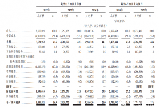 但在国内市场,东鹏饮料业绩快速增长。招股书显示,2022年至2024年,东鹏饮料营业收入分别为85.05亿元、112.57亿元、158.3亿元,年复合增长率为36.5%,净利润分别为14.41亿元、20.4亿元、33.26亿元,年复合增长率达52.0%。而今年上半年,公司实现营业收入107.32亿元,同比增长36.37%,净利润为23.75亿元,同比增长37.22%,业绩保持增长态势。