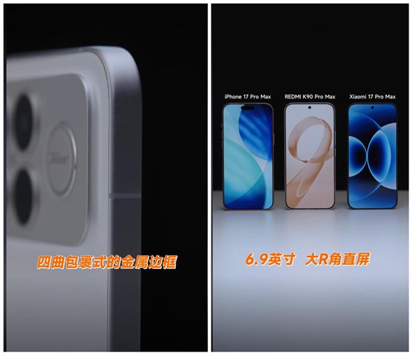 卢伟冰介绍,REDMI K90 Pro Max采用6.9英寸大R角直屏,尺寸和iPhone 17 Pro Max一致,视觉观感非常惊艳,机身采用四曲包裹式金属中框,背部是横向大矩阵相机DECO。