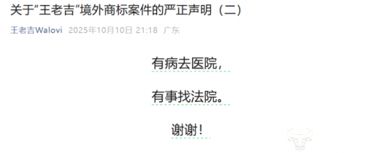 10月10日,加多宝再次发文强调其已在2000年初合法获得海外王老吉商标所有权,随后王老吉以“有病去医院,有事找法院。谢谢!”12字进行回应。
