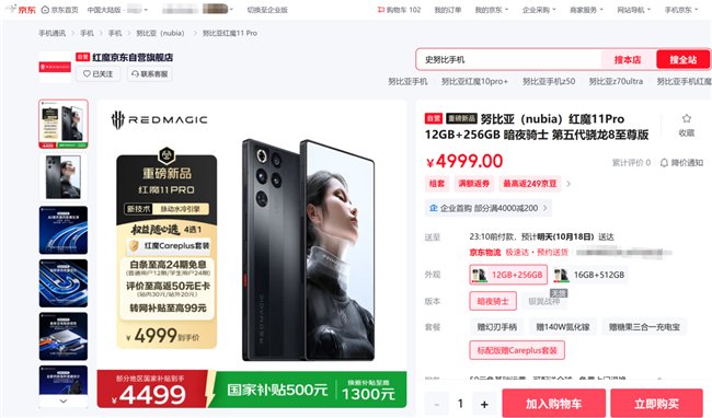 10月17日,红魔11 Pro系列正式发布,售价4999元,现已开售。为带给消费者更多权益,京东携手红魔打造先人一步加速换新计划,提供限量新品现货优先发货,最快下单后半小时内送达。京东11.11火热进行中,10月17日发布当天来京东先人一步下单红魔11 Pro系列还可享限量权益随心选,包括红魔Careplus套装(含一年冰芯保、一年清灰保、一年碎屏保、一年后盖保、一年镜头保、四年电池保)、电竞套装(红魔幻刃手柄)、快充套装(140W氘锋氮化镓)、续航套装(糖果三合一充电宝),四项权益可任选其一。此外,来京东下单红魔11 Pro系列,部分地区可享国补立减500元,售价4499元起,还可享12期免息、以旧换新至高补贴1300元、学生专属24期免息、评价晒单至高返50元E卡、转网补贴、互联网礼包、游戏礼包、直播间下单赠壳膜等福利,通过“京补合约”下单至高补千元。