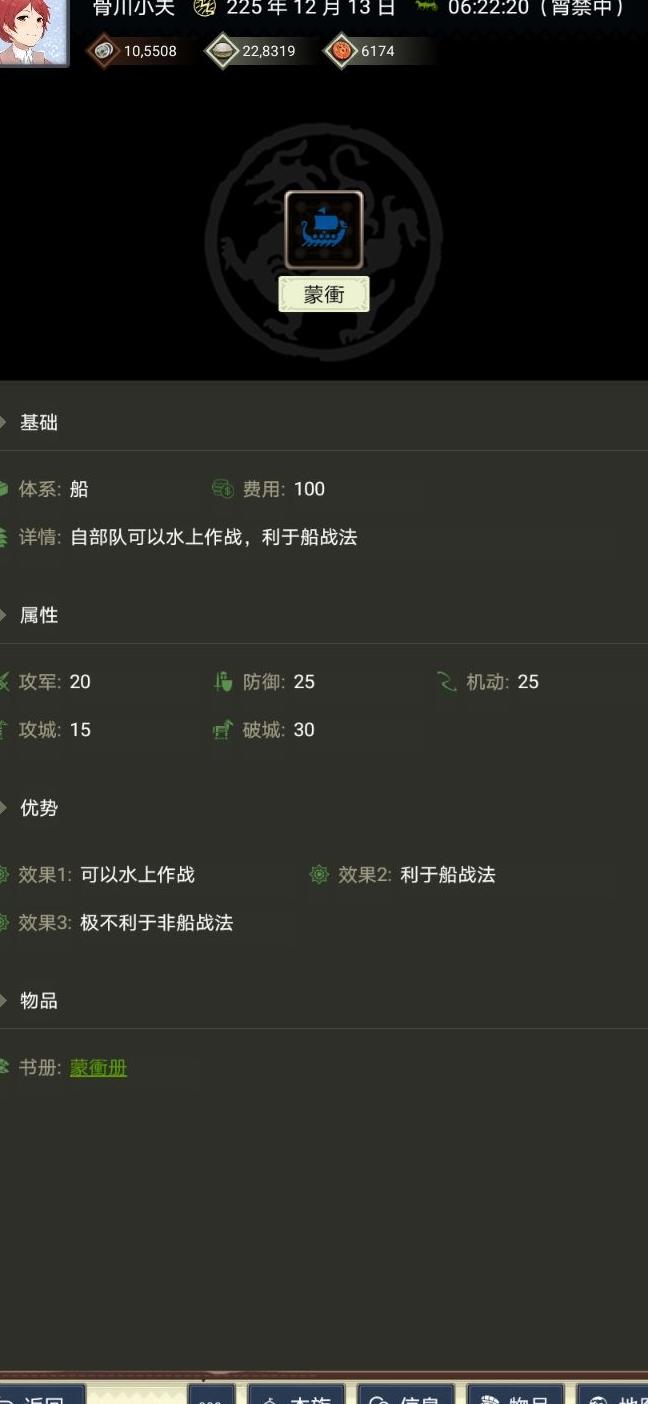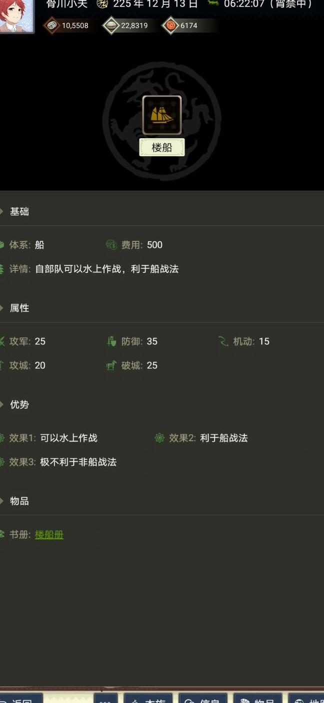 船只按大小分为小(走舸)、中(蒙冲)、大(楼船)三类,初始为小型船,速度快但攻防弱。通过战争科技可解锁中型和大型船,虽速度较慢,但攻防能力显著增强,可根据战况灵活选择,实施针对性布阵与战术部署。