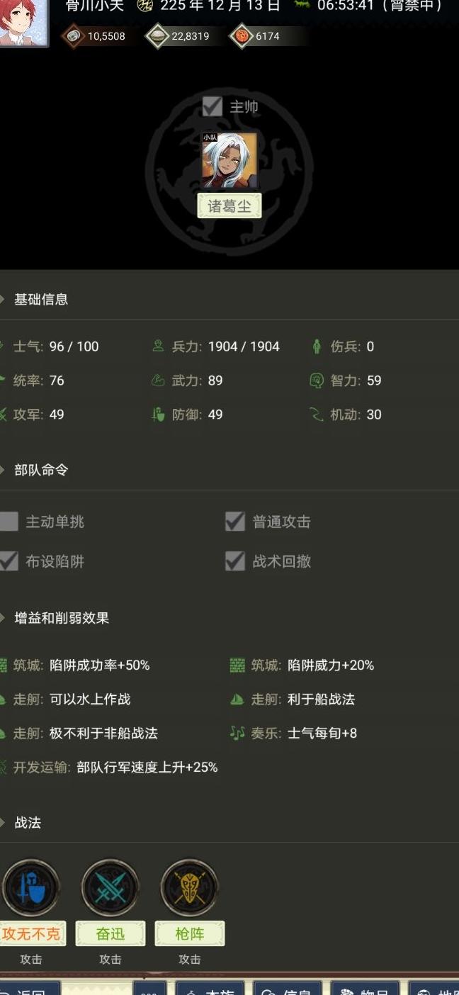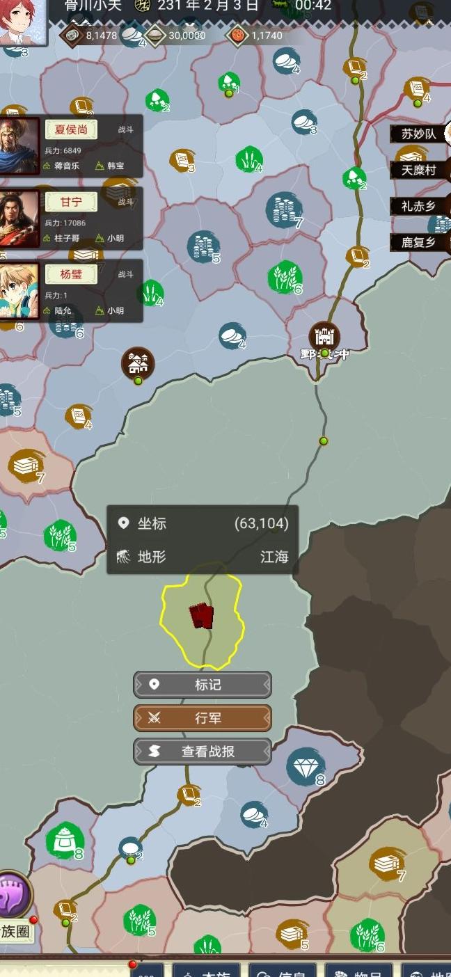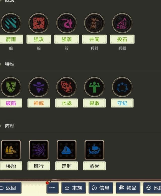 阵型选择:走舸用于低级地和逃跑,楼船适用于高级地与对抗强敌,锥行则专为攻占地块设计。