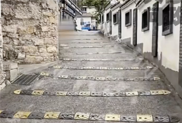 而网友反映的下坡路段长约20米,车辆通行区域狭窄,会车十分困难,沿途密集设置了16条减速带。