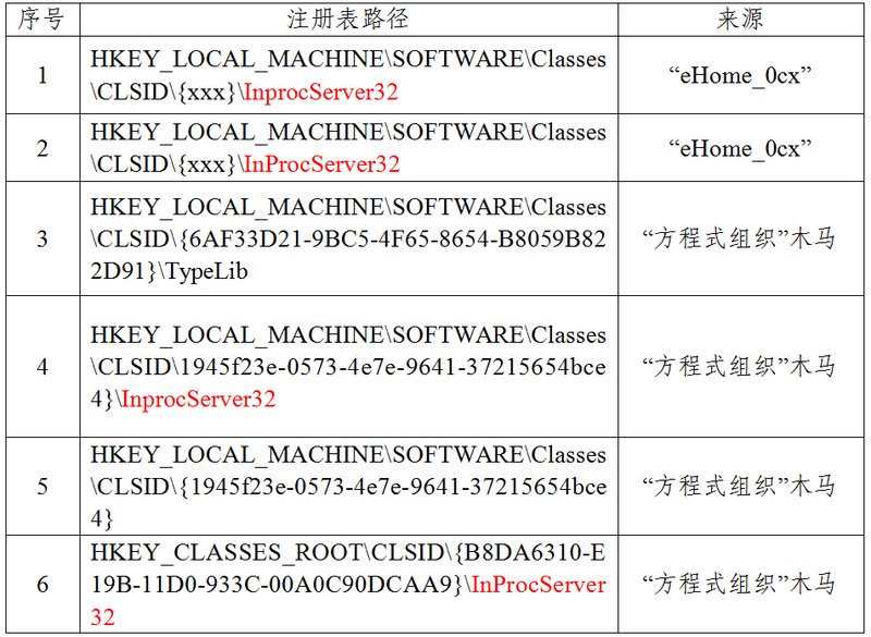 “eHome_0cx”的部分驻留文件通过修改注册表InprocServer32键值的方式,劫持了系统正常服务,在系统正常程序启动前加载实现自启动。注册表修改位置与NSA“方程式组织”所使用网攻武器相同,均位于HKEY_LOCAL_MACHINE\SOFTWARE\Classes\CLSID下随机ID项的InProcServer32子项。