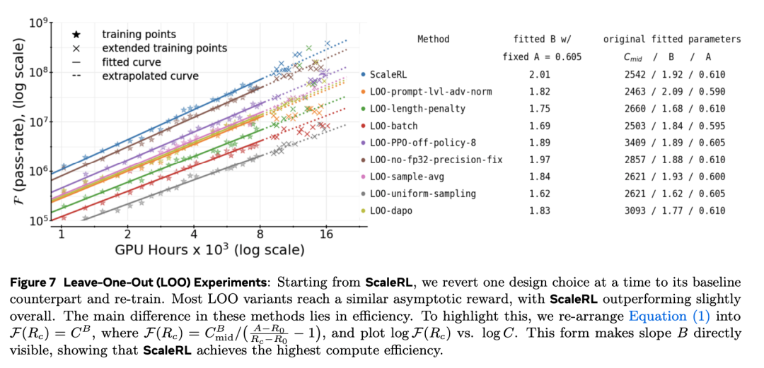 为了验证上述设计在组合后的有效性,作者进行了留一法(LOO)实验。实验结果(如图 7 所示,规模均为 16,000 GPU 小时)显示:在所有设计轴上,ScaleRL 一直是最优配置,无论在最终回报还是算力效率上,都略优于任何单项被移除的变体。