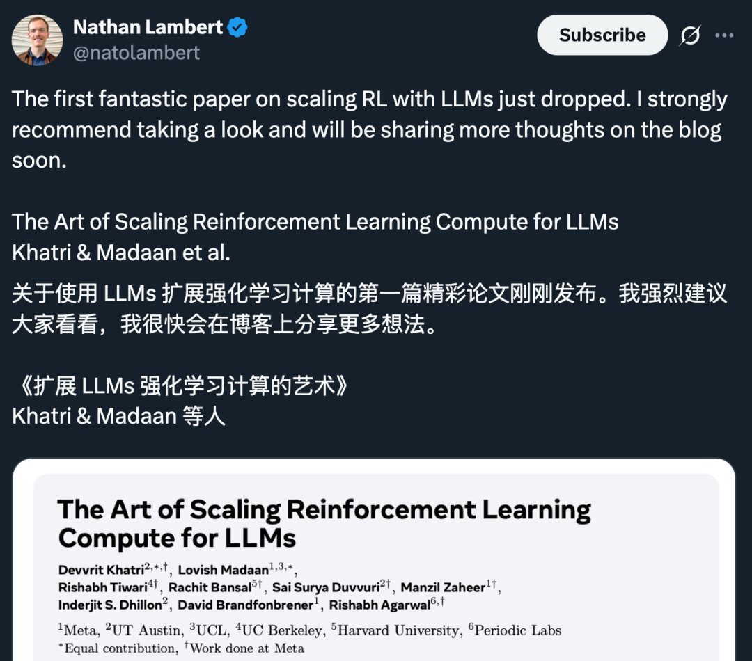 这篇论文是首个关于 LLM 强化学习扩展的开源、大规模系统性研究,其内容非常翔实,结论也足够有参考价值,因此受到了 Ai2 科学家 Nathan Lambert 等人的强烈推荐。