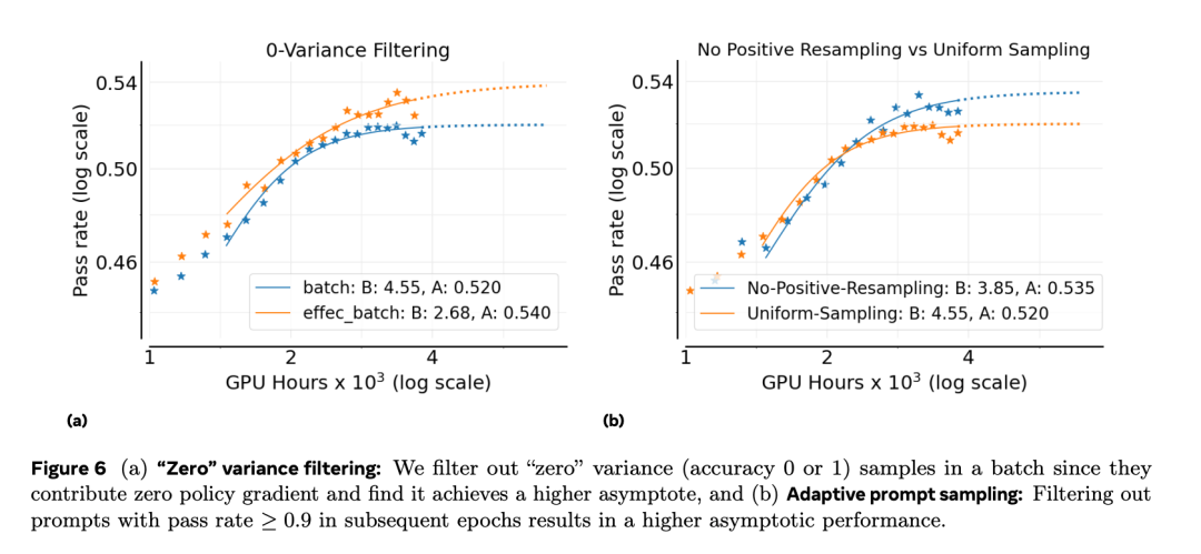 图 6a 中的结果表明,使用「有效 batch」(即过滤掉奖励方差为零的样本)可以获得更好的最终性能,因此作者在 ScaleRL 中采用该策略。