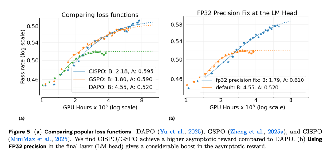 图 5a 表明,GSPO 和 CISPO 的表现都显著优于 DAPO,在最终通过率 A 上有大幅提升。CISPO 在训练过程中展现出更长时间的线性回报增长趋势,并在后期略优于 GSPO,因此作者选择 CISPO 作为 ScaleRL 的最佳损失类型。