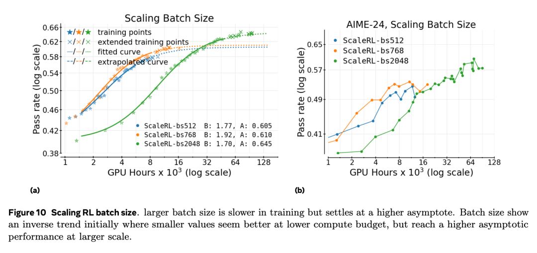 在本文最大规模的数学任务(见图 1)中,将 batch size 提升至 2048 个 prompt 后,不仅稳定了训练,还使得从 50k GPU 小时拟合的曲线能够准确外推到最终 100k 小时的结果。