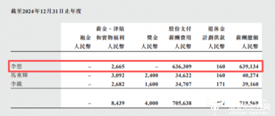 其实,这和新势力车企的股权激励相关。财报数据显示,2024年李想的薪酬总额为人民币6.39亿元,其中包括薪金、津贴和实物福利266.5万元、退休金计划供款16万元以及高达6.36亿元的股份支付薪酬费用。据悉,当时理想汽车的年报一发布,公司董事长李想的薪酬就引发了热议。