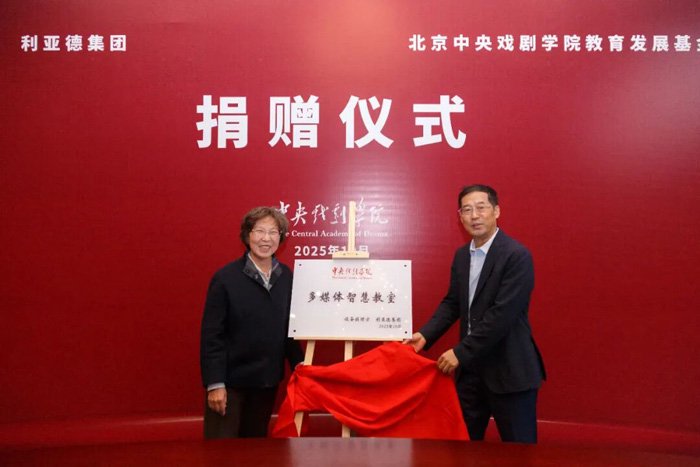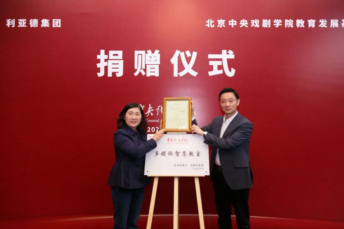 陈志坚理事长与李军董事长共同为中央戏剧学院多媒体智慧教室揭牌,学院向利亚德授予捐赠证书,郝戎院长代表学院向利亚德表示感谢。