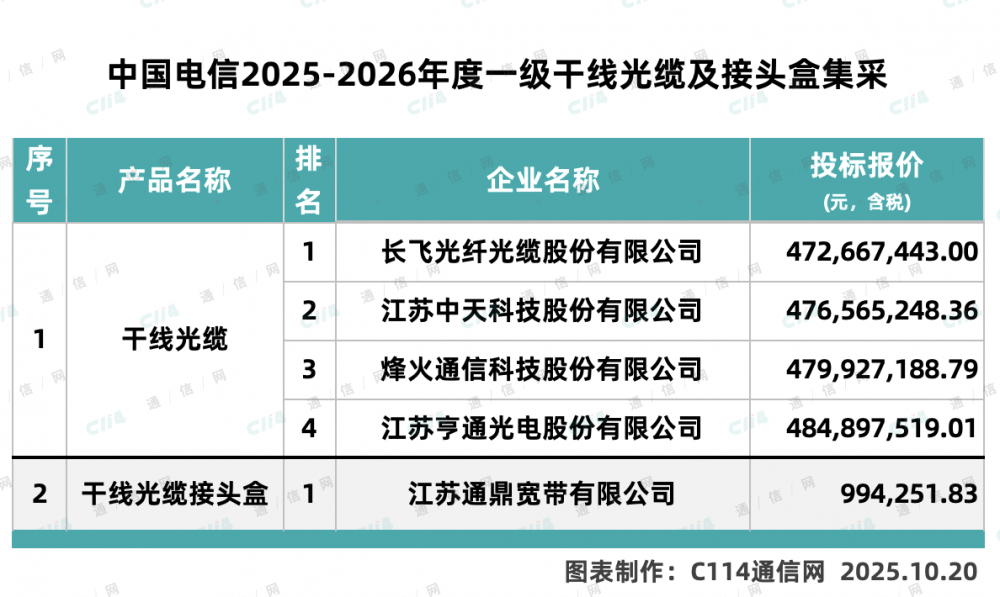 C114讯 10月20日消息(水易)来自中国电信阳光采购网消息,中国电信2025-2026年度一级干线光缆及接头盒集中采购项目评标委员会按照招标文件载明的评标方法和标准已完成对各投标人递交的投标文件的评审。