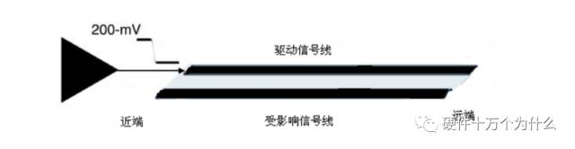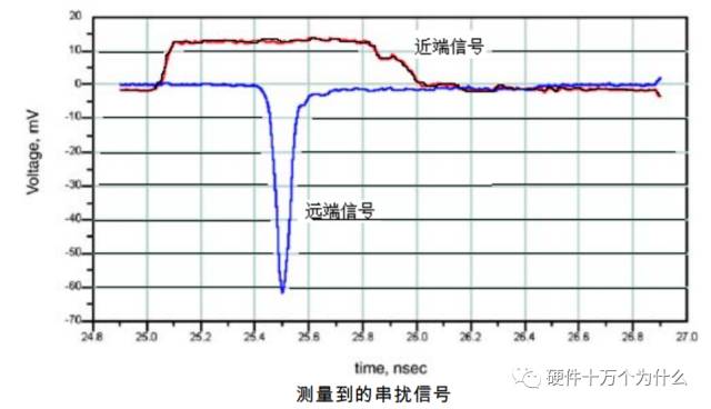 由于导线之间间距过小,当有快速变化的电流 流过导线时会产生交变的磁场,而使邻近的导线上 感应出信号电压,称为串扰(Crosstalk)。 下图为信号串扰试验模型,以及受影响信号线上的串扰信号。