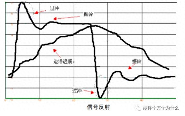 由于传输系统阻抗不匹配,会使传输的信号不 能被完全吸收,造成部分能量返回。反射造成信号出现过冲(Overshoot)、振铃(Ringing)、边沿迟 缓(阶梯电压波)。过冲是振铃的欠阻尼状态,边沿迟缓是振铃的过阻尼状态。下图为信号反射的三种表现形式。