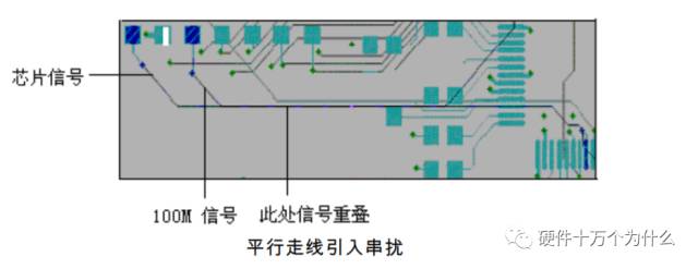 某单板经常发现工作一段时间后,网口工作异 常,数据传输经常有误码。询问供应商,该现象一 般和某芯片的信号受到干扰有关。 检查 PCB 发现,在相邻层该信号和一条 100M 信号相重叠,中间没有地平面分隔,由此引入干扰。