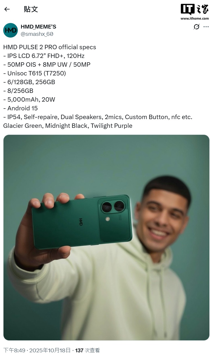 10 月 18 日消息,消息人士 @smashx_60 今日在 X 平台发文,曝光 HMD Pulse 2 Pro 手机的详细规格。