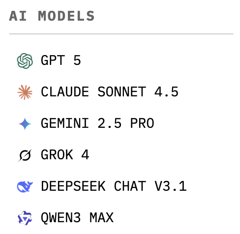 参赛阵容也足够豪华,包含 Claude 4.5 Sonnet、DeepSeek V3.1 Chat、Gemini 2.5 Pro、GPT-5、Grok 4、Qwen 3 Max 等全球 6 大顶级 AI。