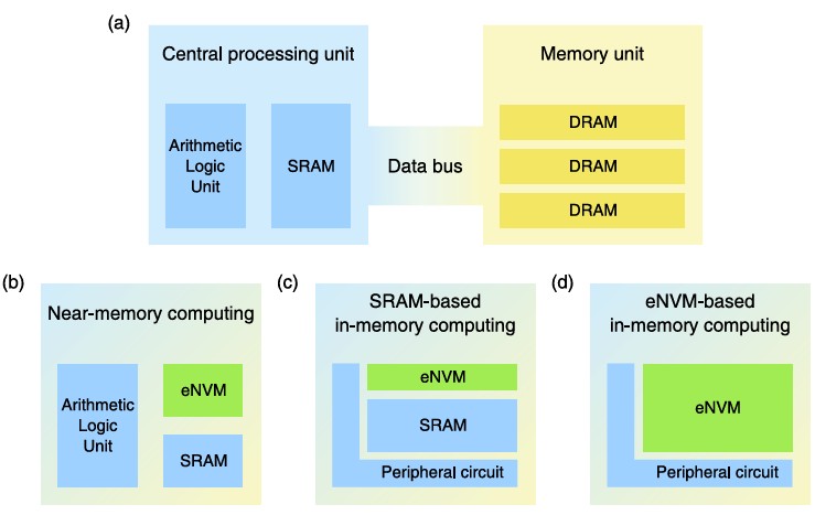 图 1.计算架构从 (a) CPU 和内存分离的传统冯诺依曼,到 (b) 近内存计算,再到使用 (c) 基于 SRAM 和 (d) 基于 eNVM 的实现的真正的内存计算方法。(图片来源:IEEE)