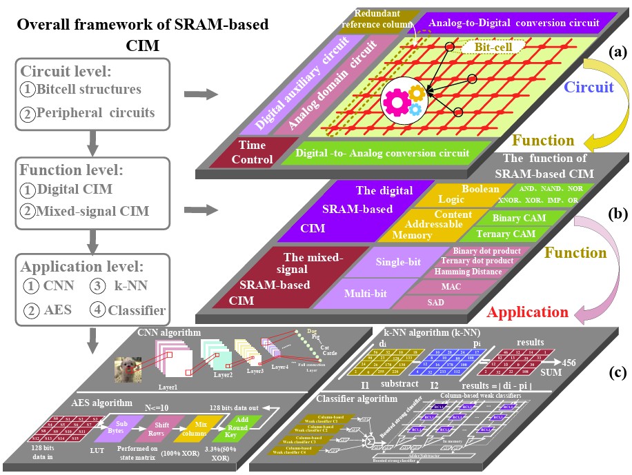 图 2.基于 SRAM 的内存计算的完整框架显示了从 (a) 使用比特单元结构和外围电路的电路级实现,到 (b) 包括数字和混合信号作在内的功能能力,再到 (c) CNN、AES 加密和分类算法等实际 AI 应用的进展。(图片:研究)