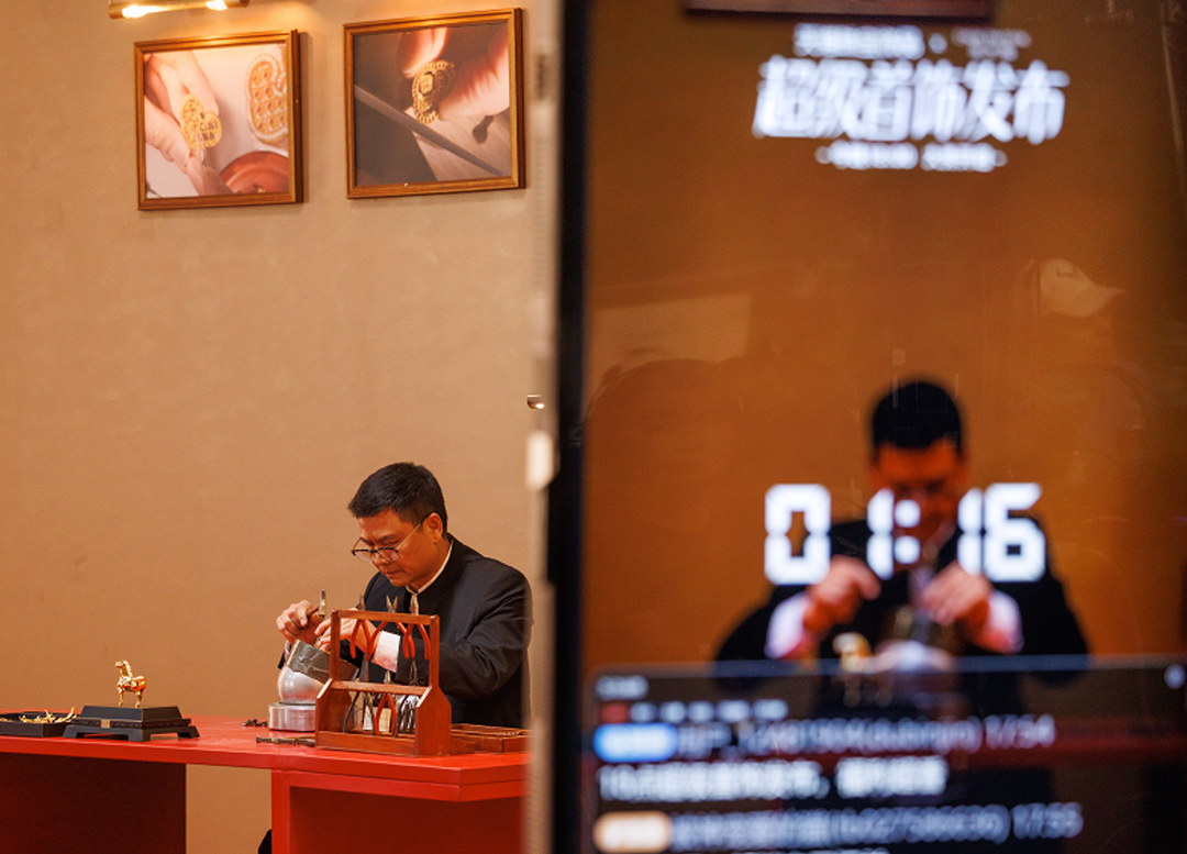直播中特别设置的“黄金痛屋”成为关注热点,包括可使用的黄金手包、造型独特内有乾坤的黄金茶壶,以及以太和殿脊兽为原型的系列作品。在产品层面,故宫系列成为本次直播的文化亮点,不仅有玲珑花蝶、福蝶知春等经典作品依次亮相,设计师还带来新作“万华如意”,把传统元素与创新设计进行了巧妙融合。
