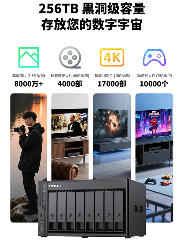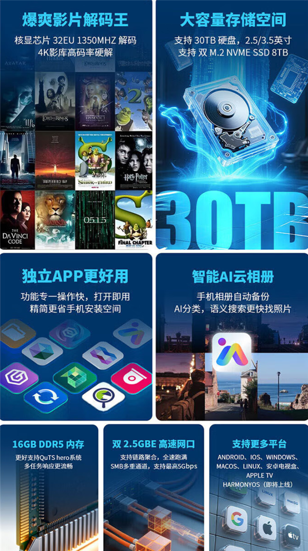 Qu系列抢先支持希捷酷狼首发的30TB硬盘(CMR传统磁记录方式),这使得8盘位机型Qu805 的极限存储容量可接近256TB!