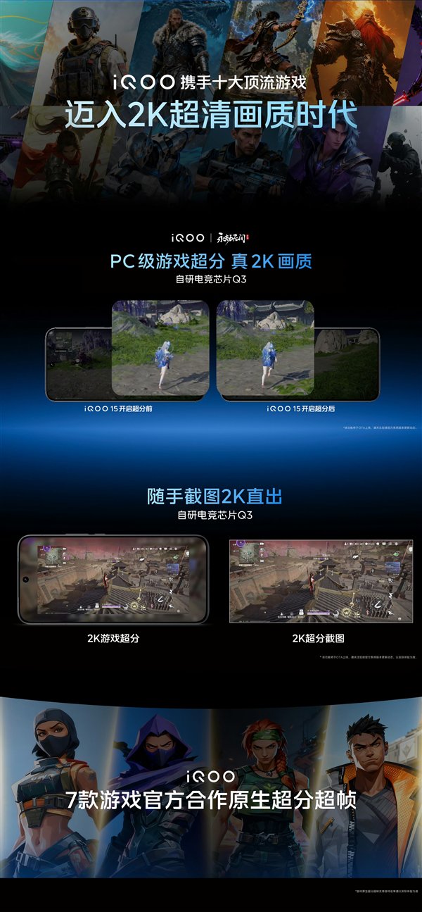 另外,iQOO 15带来行业独家真2K游戏画质,行业独家FPS游戏2K+144帧满格并发,支持7款游戏原生超分超帧。