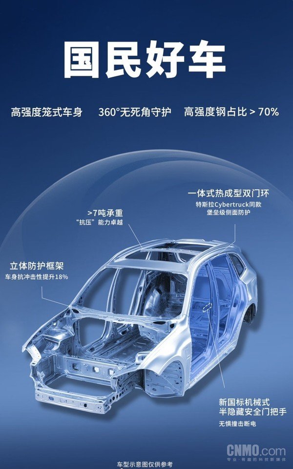 其正面立体防护框架使车身抗冲击性提升18%,侧面配备一体式热成型双门环,采用与特斯拉Cybertruck同源技术,并搭配新国标机械式半隐藏安全门把手。