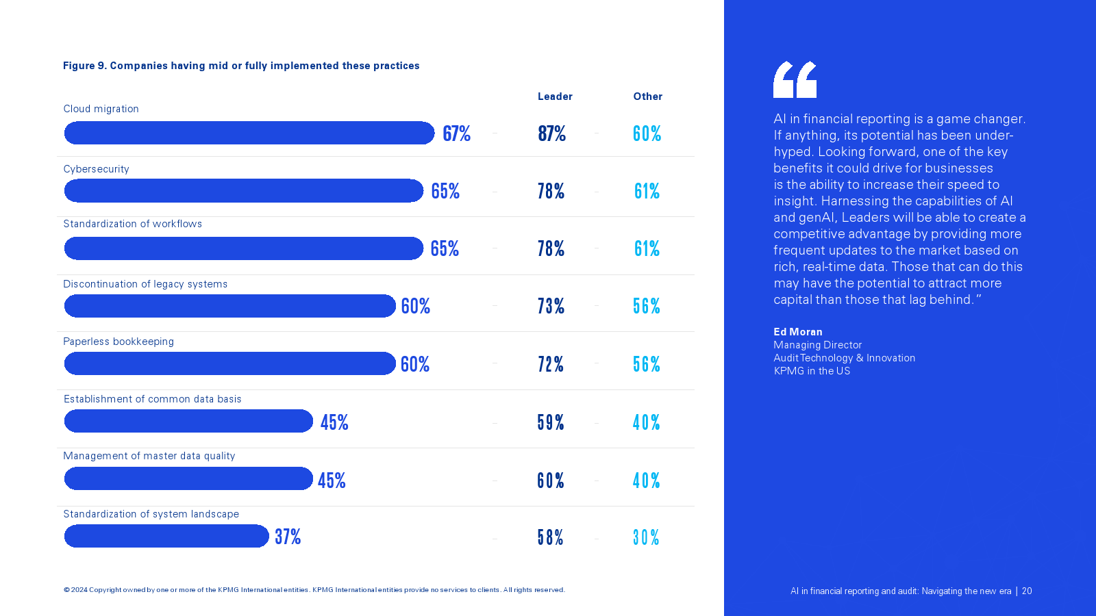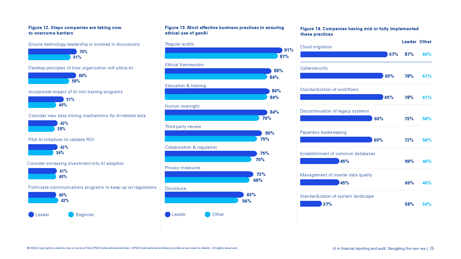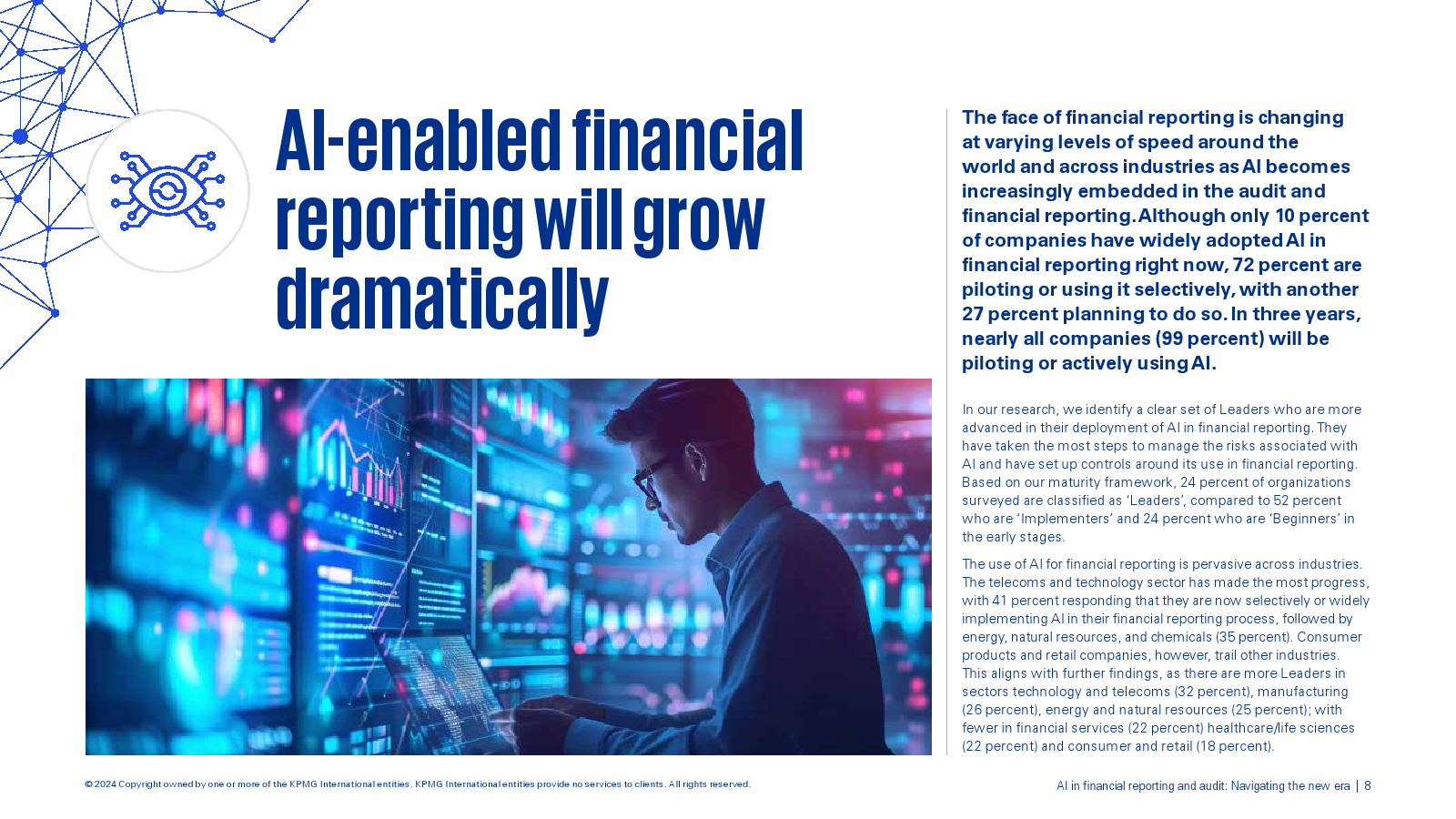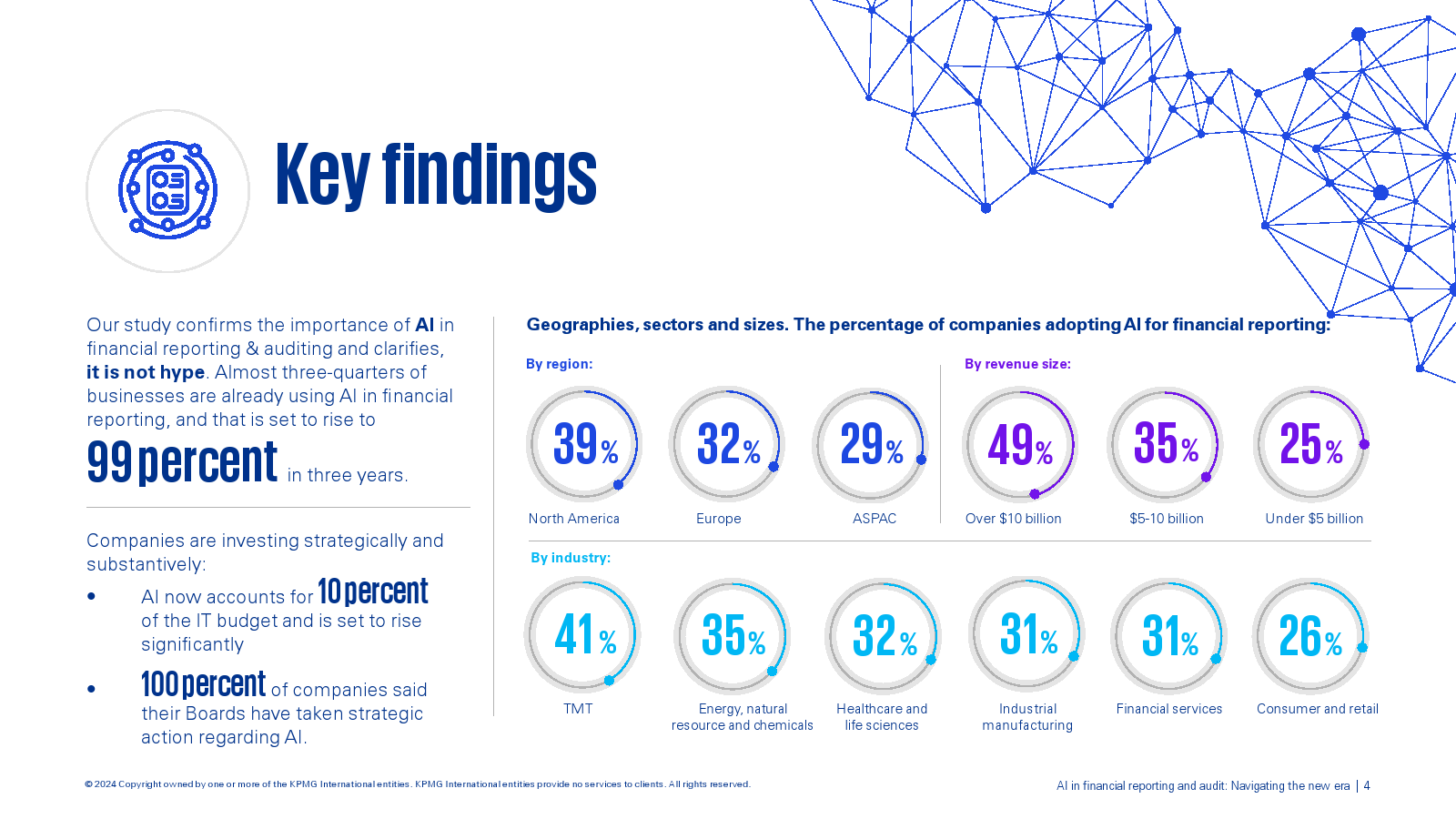 根据毕马威国际的全球研究,人工智能已经被广泛应用于公司的财务报告流程中,72%的企业正在试用或使用它,在未来三年内,这一比例将增长到几乎普遍的水平(99%)。
