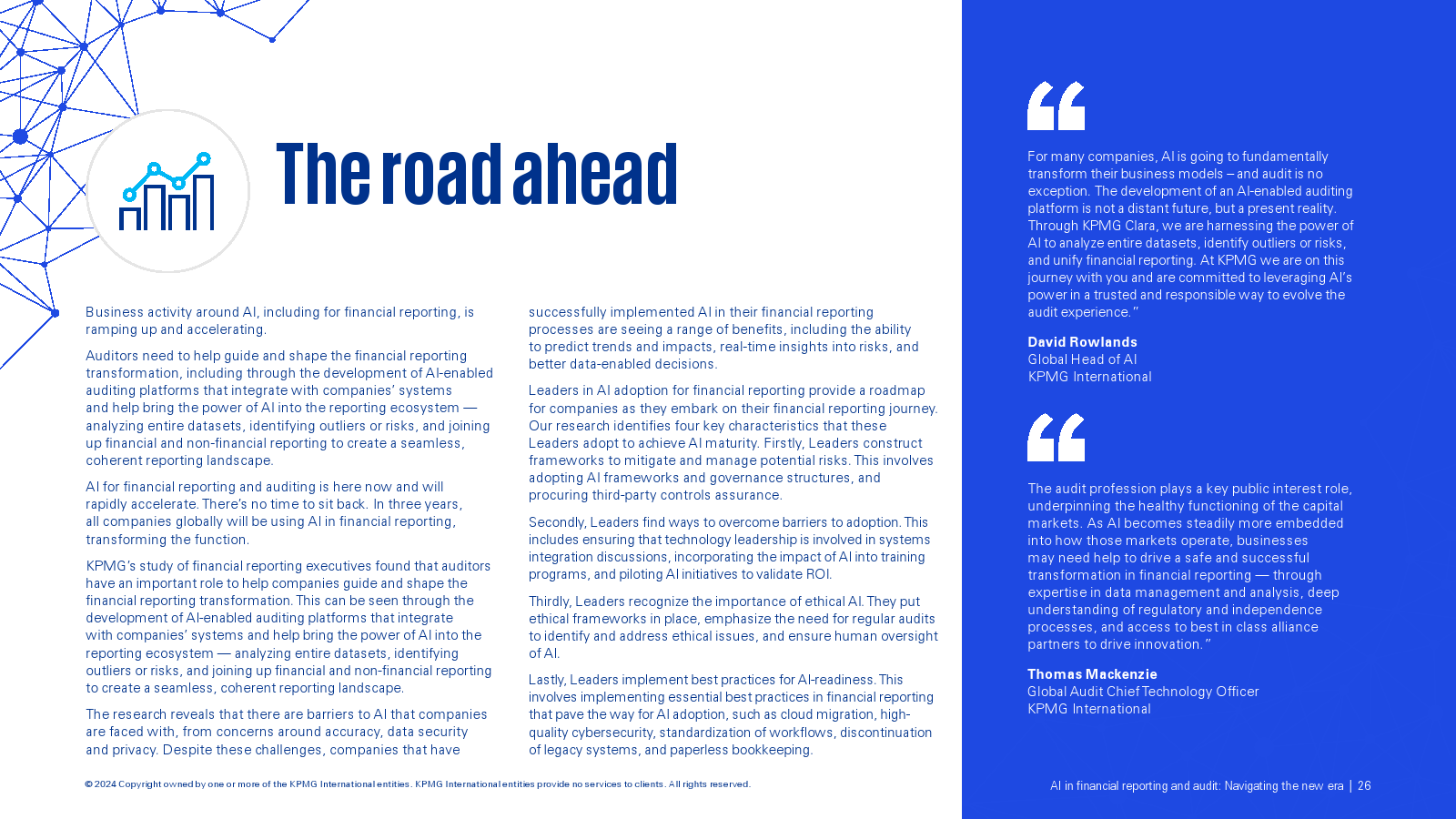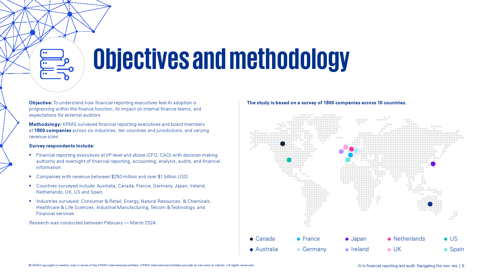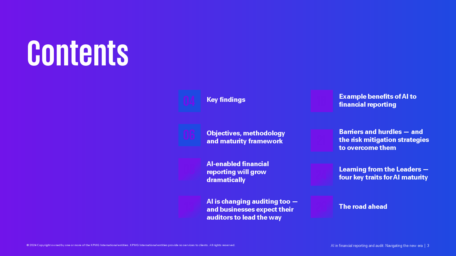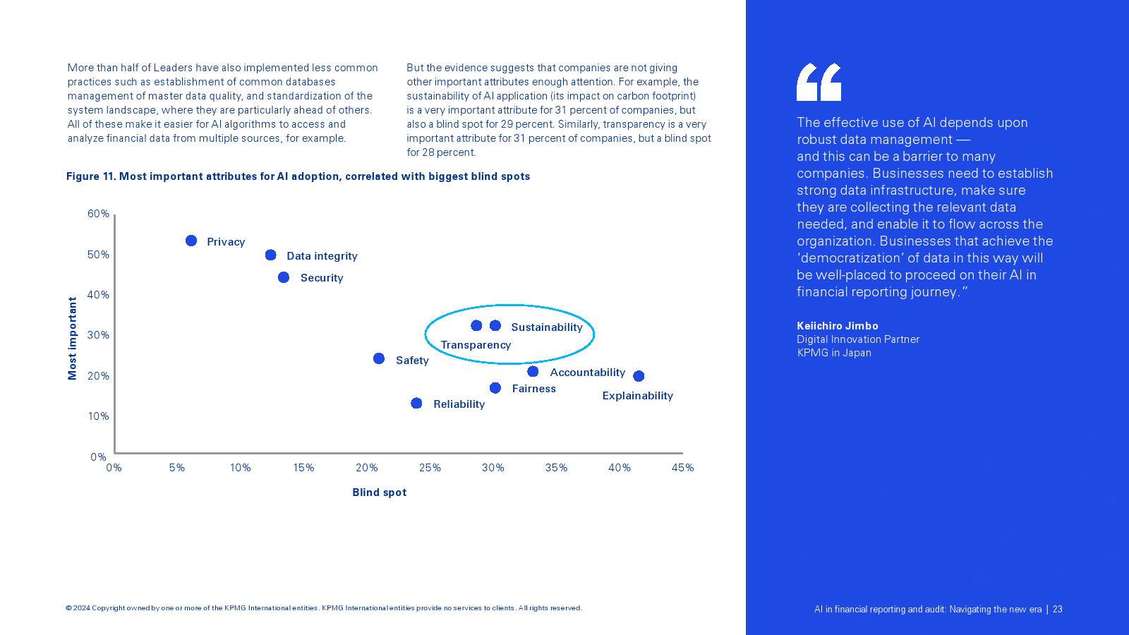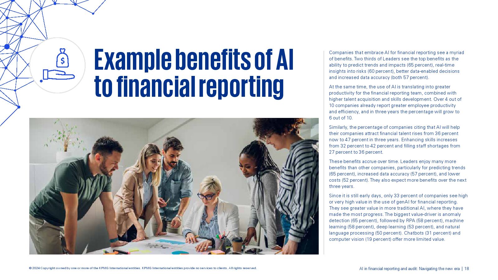 根据毕马威国际的全球研究,人工智能已经被广泛应用于公司的财务报告流程中,72%的企业正在试用或使用它,在未来三年内,这一比例将增长到几乎普遍的水平(99%)。