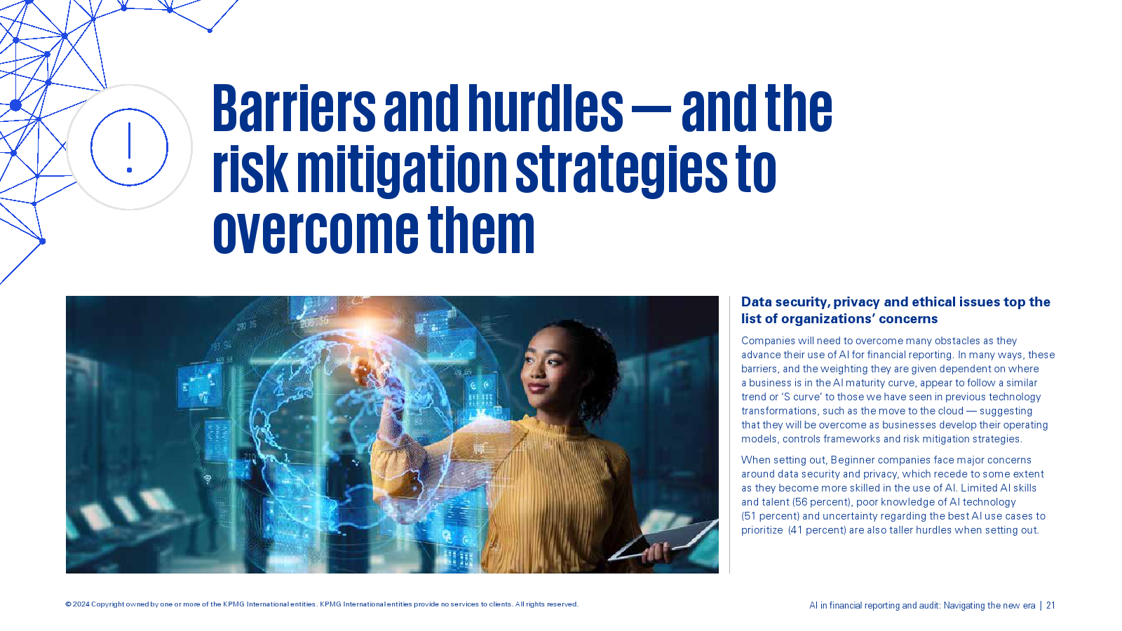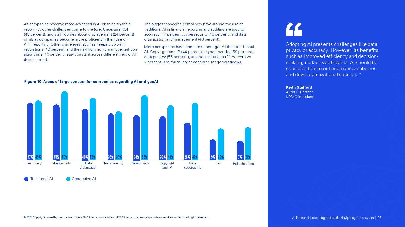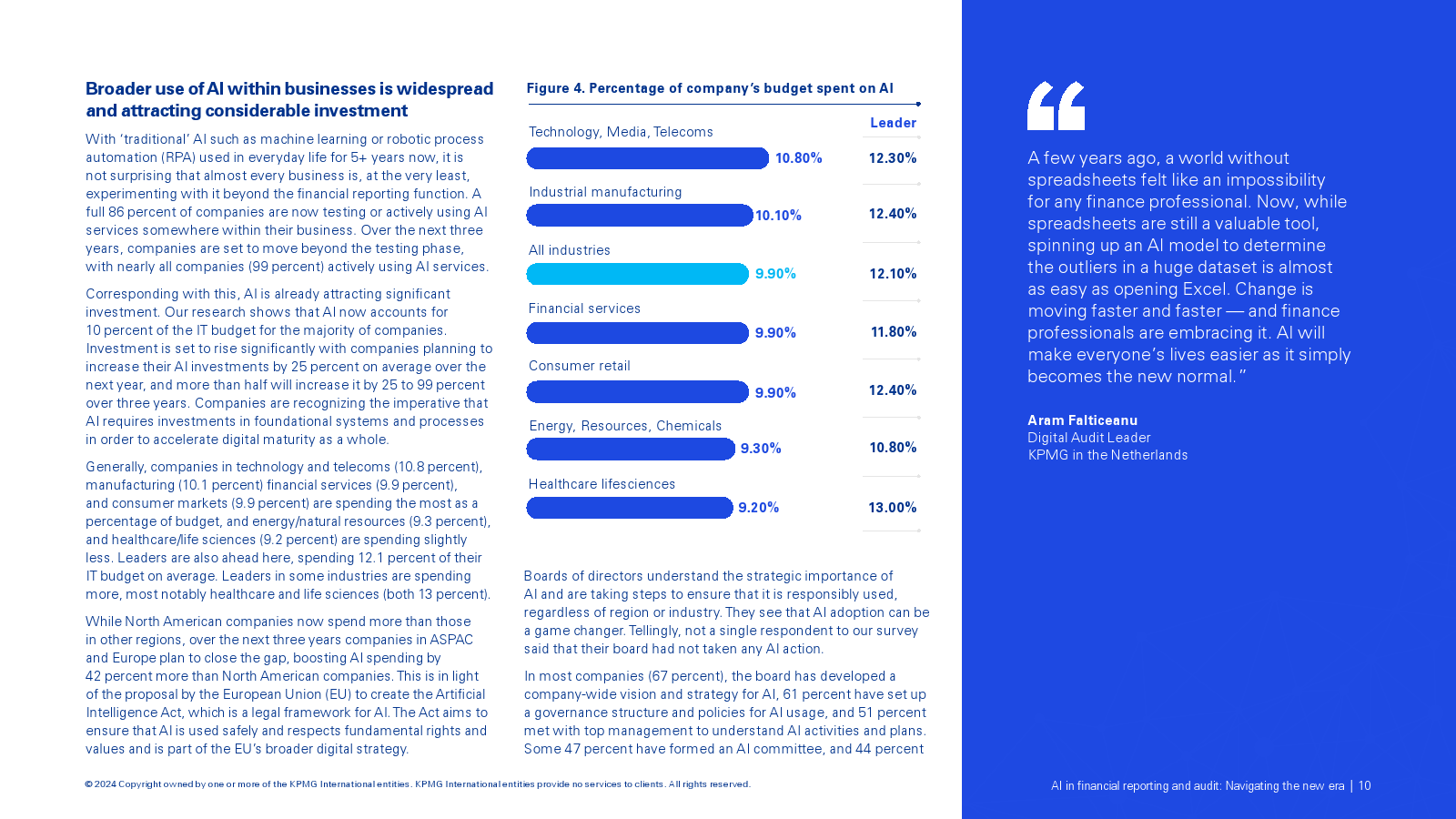 北美公司的发展速度最快,该地区39%的公司有选择地或广泛地采用人工智能进行财务报告,其次是欧洲(32%)和亚太地区(29%)。