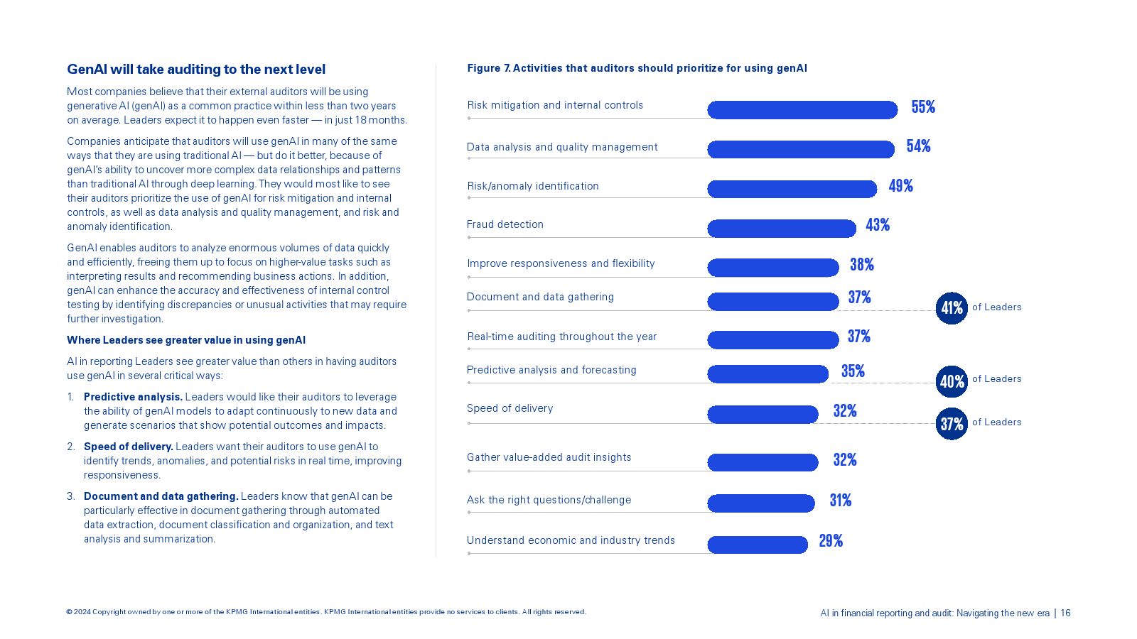 超过3/4的公司认为,人工智能与自动化和数据分析一样,对外部审计人员来说是中等到非常重要的,这些都与人工智能的采用密切相关。大部分公司(82%)认为,他们的审计师在采用人工智能进行财务分析方面领先或与他们持平。