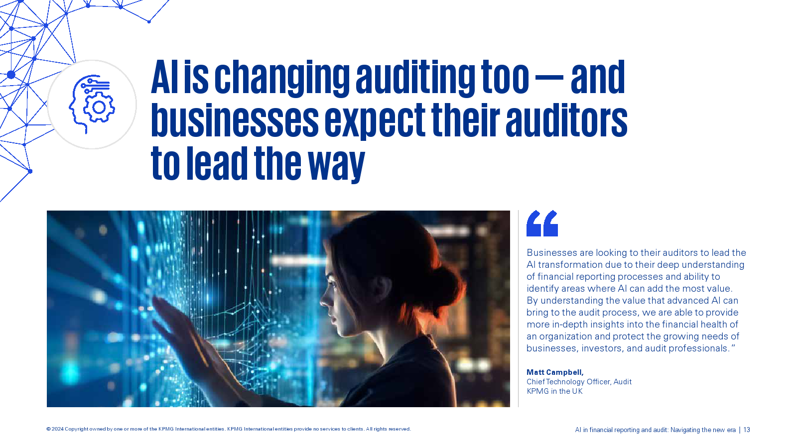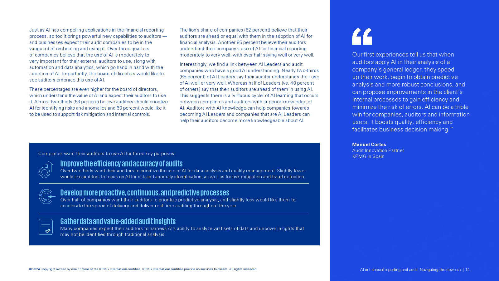 他们希望审计师在审计中部署人工智能,主要有三个目的: