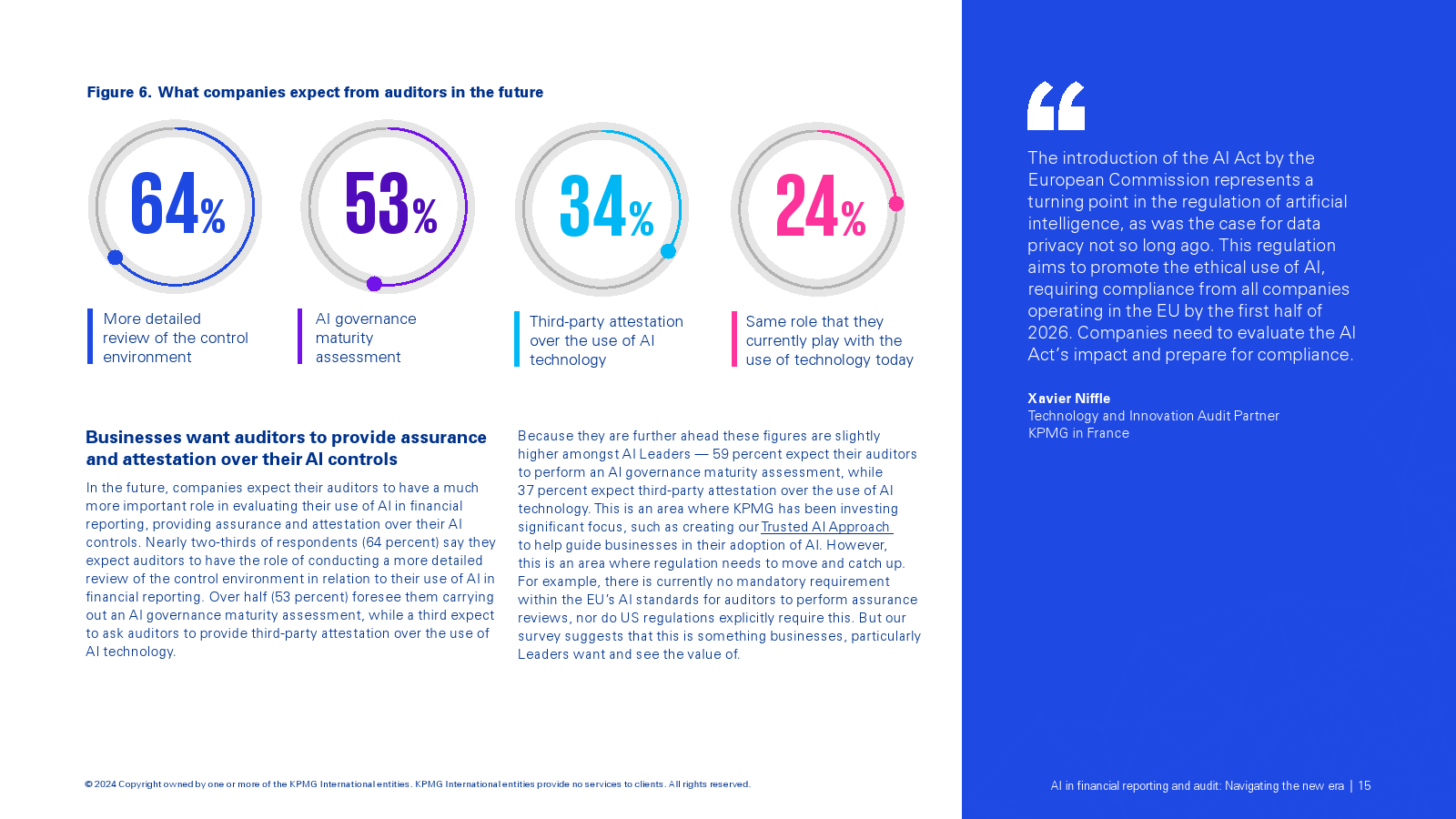 近2/3的受访者(64%)希望审计师能够对与在财务报告中使用人工智能相关的控制环境进行更详细的审查。超过一半的受访者(53%)预计审计员将进行人工智能治理成熟度评估;1/3的受访者希望提供人工智能技术使用的第三方认证。