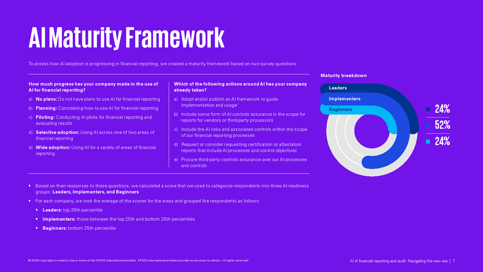 公司规模也会影响采用率,规模最大的企业在采用率方面遥遥领先。毕马威的研究将成熟度框架分为三类:领导者(24%的企业)、实施者(52%)和初学者(24%)。在收入超过100亿美元的10家大公司中有4家是领导者,而在收入低于50亿美元的公司中比例不到一半。