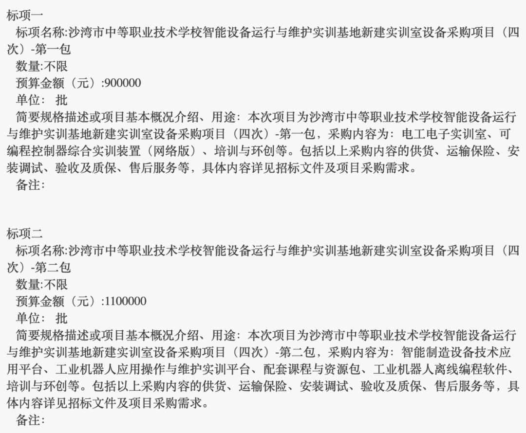 4月2日,“沙湾市中等职业技术学校智能设备运行与维护实训基地新建实训室设备采购项目”公开招标,预算金额200万元。本次项目拟建智能设备运行与维护实训室三间,包括:电工电子实训室一间,购置设备6套;PLC实训室一间,购置设备10套;工业机器人实训室一间,购置设备4套;购置软件10套。包括以上采购内容的供货、运输保险、安装调试、验收及质保、售后服务等。