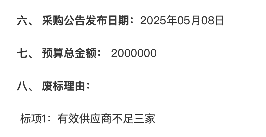 5月8日,本项目第二次招标。6月12日,再次发布废标公告,因有效供应商不足三家。
