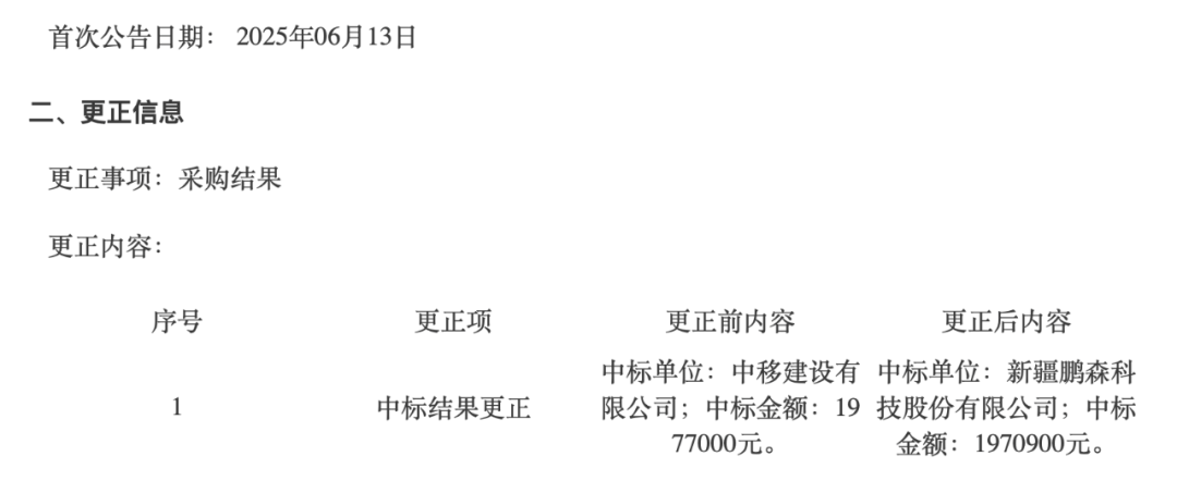 8月25日,项目发布结果更正公告。中标人更正为新疆鹏森科技股份有限公司,中标金额197.09万元。