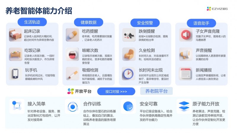 早在6月举办的ECDC萤石云开发者大会上,萤石正式发布的养老智能体,凭借分层协作的核心技术架构,通过前端小模型与云端大模型的高效协同,实现了数据处理效率与识别精准度的双重突破。