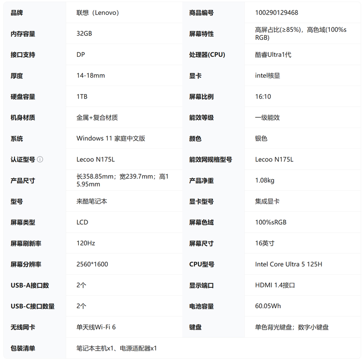 性能方面,Lecoo Air16酷睿版搭载了英特尔酷睿Ultra 5 125H处理器,拥有4P+8E+2LPE核心配置,共计14核心18线程,最高睿频可达4.5 GHz,并集成了基于全新Alchemist Xe-LPG架构的锐炬显卡,拥有7组Xe核心,足以应对日常办公、内容创作及轻度网游等多元化需求。为了确保系统流畅运行与充足的存储空间,该笔记本还一步到位地搭配了32GB大内存和1TB SSD。此外,尽管机身轻薄,但其接口配置却相当实用,提供了双USB Type-C、一个全尺寸HDMI以及一个USB Type-A接口,充分满足了外接显示器和各类传统外设的需求,无需额外携带转接器,内置的60.05Wh电池也为移动使用提供了续航保障。